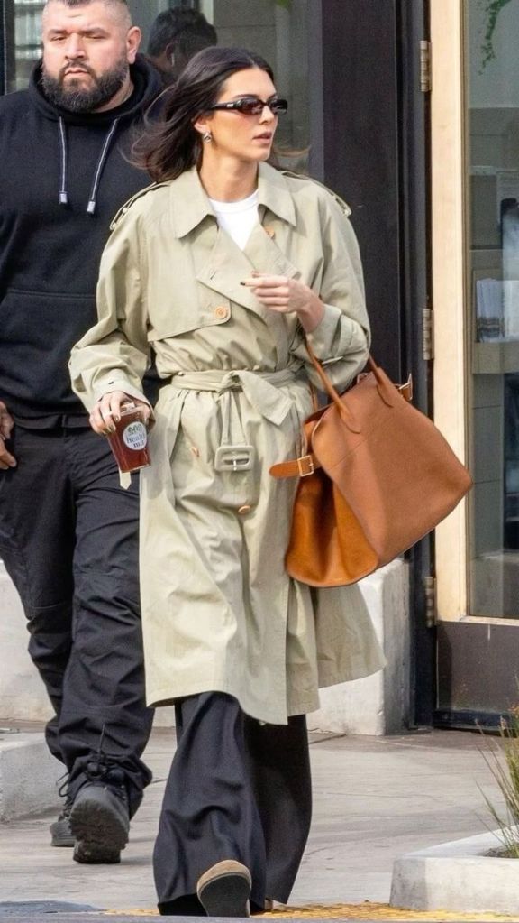 Kendall Jenner loves to wear capsule pieces and make her looks pop with statement accessories, just as we can see here. The base only includes a white T-shirt and wide-leg black black pants with a casual trench coat and matching leather clogs. This is very much a model off-duty outfit, but what makes it pop is The Row Margaux bag in a solid brown color, which matches the beige-greenish coat and her vintage brown sunglasses. Wearing a capsule outfit is super easy, with using clothes that you feel comfortable in and just adding one or two detailed accessories to make the effortless look put together.