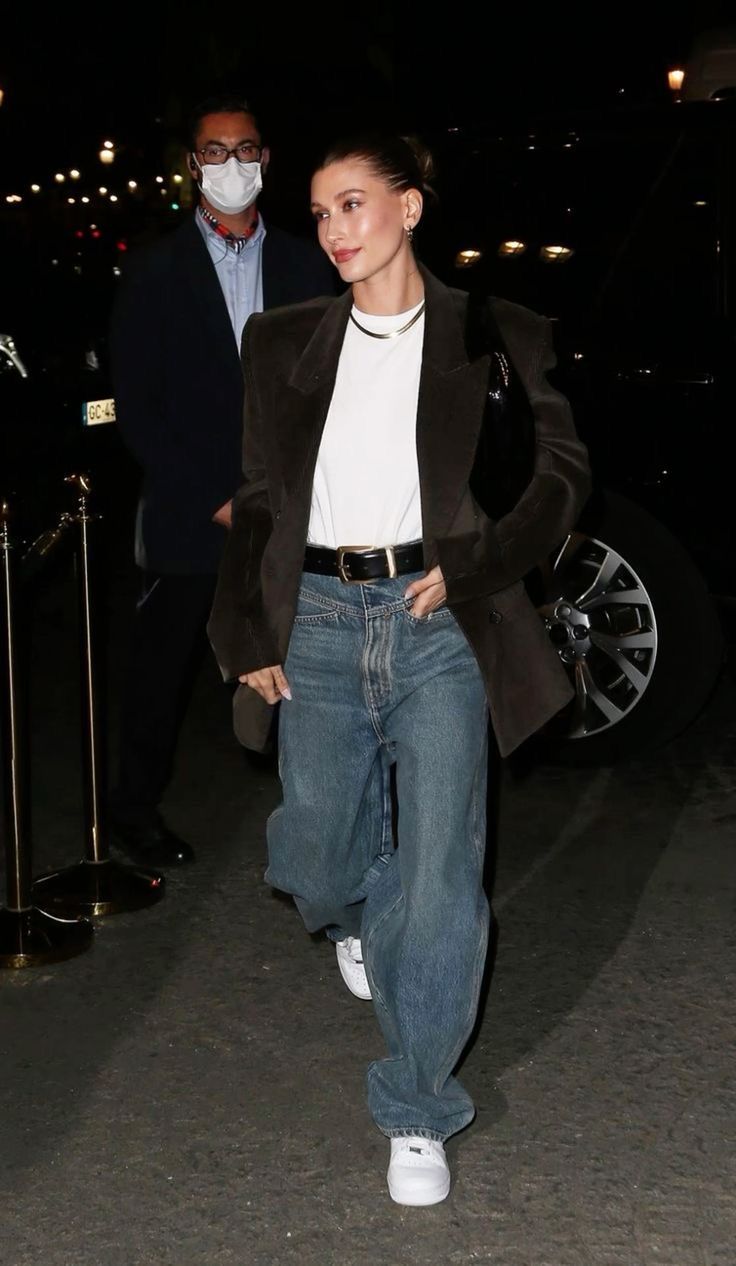 In these cases, we can see two super casual everyday looks, which creates an incredibly sophisticated, chic vibe with the use of oversized blazers and with the three color rule. If you heard about the quiet luxury aesthetic, you are probably familiar with the three color rule. This makes a combination of three neutral colors where you select the outfit and the accessories only including different shades of those three main tones. Hailey Bieber used white, denim blue and dark brown.The dark denim tone goes really well with the dark brown shade, the white T-shirt and sneakers creates a contrast for the whole look. The selection of the two white pieces are an easy sandwich method, where you pair the colors at the top and the bottom of the outfit.