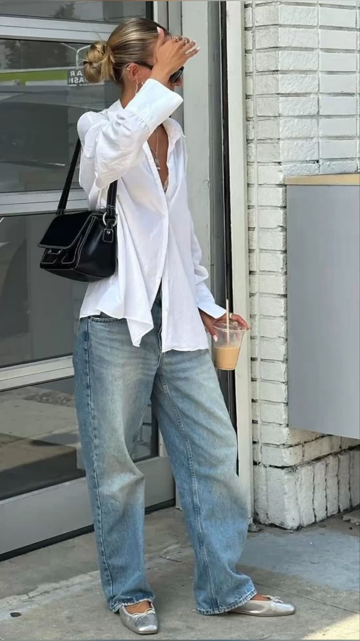 Ez a kombináció egyszerű, mégis örök az igazi klasszikus, amely teljesen beillene napjaink quiet luxury trendjébe. Egy oversized fehér ing lezser eleganciát ad, a világos farmer pedig tökéletesen illik a tavaszi hangulathoz. Az ehhez hasonló outfitekhez a legjobb inspiráció számomra örökre Lady Diana lesz, hiszen nincs is tökéletesebb példa, hogy mennyire kifinomult és nőies tud lenni egy ehhez hasonló öltözék a mindennapokban.